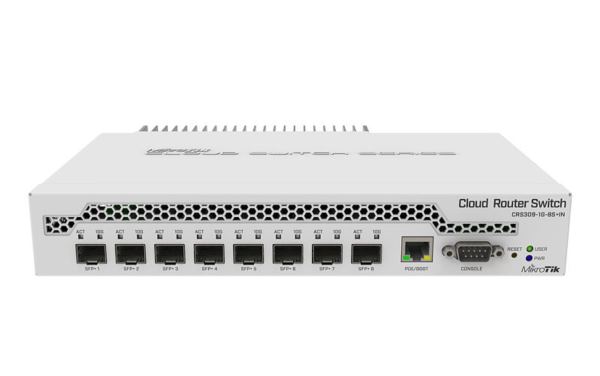 MikroTik CRS309-1G-8S IN, Desktop switch with 8x 10G SFP Slots 1 Gigabit Ethernet ports. Total switching capacity of 162 Gbps and total non-blocking throughput of 81 Gbps. Dual-core 800 MHz CPU, 512 MB RAM, a management Ethernet port with PoE power input, RS232 serial port, a grounding terminal and is capable of dual boot (choose which operating system you prefer, RouterOS, or SwOS).