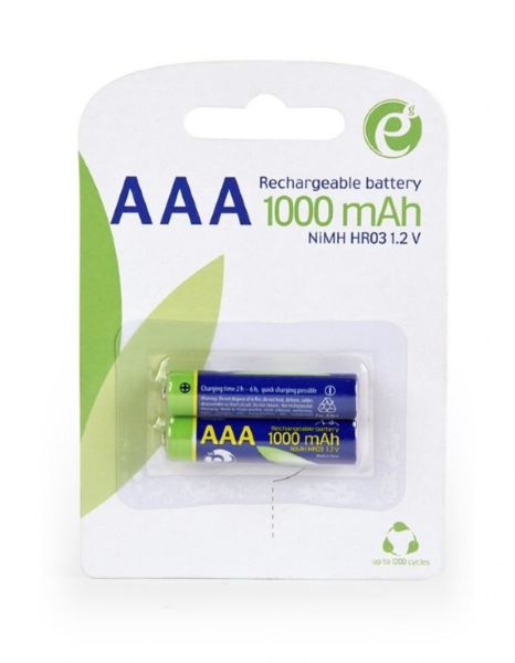 Gembird Ni-MH rechargeable AAA batteries, 1000mAh, 2pcs blister pack - Voltage: 1.2 V DC at 1000 mAh capacity Charging time: 2-6 hours depending on the charge current Recharge cycles: at least 500