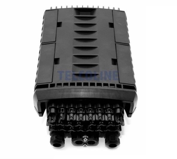 NFO Splice Closure, 4 inputs, 24 outputs, Wall and pole mount - ideal solution for overhead, underground and sewage installations. The device has 6 tiltable fiber optic trays with the possibility of arranging up to 24 splices on each Technical data: Dimensions: 388mm x 242mm x 150mm Material: Polypropylene PP Weight: approx. 5 kg Color: Black Number of splice trays: 6 Max. number of splices: 144 Number of places for adapters: 24 x SC simplex or LC duplex Max. diameters of input cables: 2x18 mm, 2x21 mm Diameters of holes in rubber sleeves for client cables: 3 mm Protection level: IP67 Operating temperature: from -30 C to 80 C Included in the set: Splice covers (60 mm long), Protective tubes for fiber distribution, Metal clamps, Metal bracket for installing the sleeve, Mounting screws, Plastic clamps, Through port caps, Alkopad (alcohol wipe), Port choke wrench