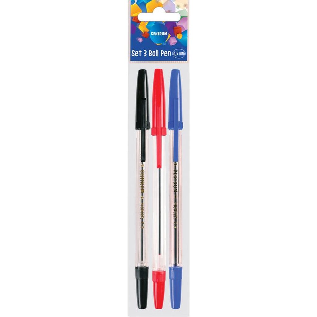Set kemijskih olovaka sadrži tri osnovne boje tinte za svakodnevnu uredsku i školsku upotrebu. Transparentno plastično kućište omogućuje kontrolu razine tinte, a debljina ispisa iznosi 0,5 mm. Boje: crvena, plava, crna. Debljina ispisa: 0,5 mm.