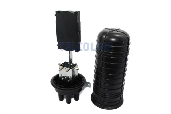 NFO Splice Closure, 4 round and 1 oval input output, pole and wall mount - Height: 445 mm, Hood diameter: 160 mm, Housing material: Polypropylene (PP), Number of trays: 2, Maximum and number of trays: 4, Maximum number of welds: 96 (4x24), Number of ports: 4 (4 round 1 oval), Inner diameter. round ports: 20 mm, Internal dimensions oval port: 33x63 mm, Working temperature: -35 C 65 C, Protection class: IP68 Kit components: 2 pcs fiber optic cassettes (trays), Welding covers, Heat-shrinkable cable covers, Fiber clip , Clamping bands (steel) , Wall bracket, Mounting clamps, Insulating tape, Numbering stickers