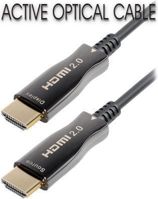 Transmedia C508-30M Active Optical HDMI 2.0 cable, 30m - Supports 4K@60Hz, YUV 4:4:4, 3D, HDR, HDCP 2.2 High-quality, high-gloss metal plugs Gold plated contacts Thin cable, only O 4,5 mm Min. bending radius 15 mm Ultra flexible, easy to install Consists of high-quality multimode fiber optic cables, Innovative digital optical converters integrated in the connectors On spool with colored information print In gift box The cable is unidirectional and therefore may not be connected to the wrong port (screen device). The plug ends are marked Display and Source .