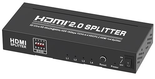 Transmedia CS25-4 - 4K HDMI 2.0 Splitter, 1 input, 4 output CS 25-4 L distributes the input signal to 4 devices. All specifications of the HDMI 2.0 version are supported, such as 4k2k@60Hz with 24bit RGB YCBCR 4:4:4 and 4k2k@60Hz with 12bit YCBCR 4:4:4, Full 3D, VESA Mode Video Format up to QSXGA@60Hz, HDR and 18 Gbps Signal Speed. Next LPCM 7.1CH, Dolby TrueHD and DTS-HD Master Audio. Compatible with HDMI 2.0, HDCP 2.2 and DVI1.0.