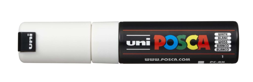 Posca markeri, proizvedeni za japansko tržište poznato po visokoj preciznosti i kvaliteti, najpoznatija su svjetska linija markera za hobi i slikanje. Izrazite svoju kreativnost crtajući i pišući po odjeći, torbicama, namještaju …Posca može sve! Neškodljiva pigmentna tinta bazi vode slična akrilu sadrži bijeli opak zbog kojeg svaka slijedeća boja potpuno prekriva prethodnu kompaktnim i sjajnim ispisom. Različite boje Posca markera mogu se miješati te tako dobijate bezbroj nijansi. Boje su kvalitetne, žive i trajne a ispis ne probija kroz papir te su stoga ovi markeri uspješni i omiljeni za crtanje postera, zidnih reklama, mapa i grafova. Pišu po svim površinama: papir, metal, drvo, plastika, glina, keramika, porculan, vinil, staklo, tekstil,... S glatkih neporoznih površina lako se brišu a ako se ispis fiksira toplinom ili premazom postaje trajan. Marker ima „felt-tip“ sistem aktiviranja vrha. Vrh markera je osjetljiv na dodir te ga treba nekoliko puta nježno pritisnuti o površinu papira da bi se tinta prvi put upila u vrh markera. To ujedno znači i da mu rok trajanja počinje teći tek od tada. Dostupan je u 35 boja. Vrh je izrazito širok za velike površine, koso rezan, izrađen od poliestera. Debljina ispisa: 8.00 mm Suši se za 10-20 sekundi. Dužina ispisa: preko 200 metara Vijek trajanja: 2 godine od otvaranja Sadržaj tinte: 17 ml Cijena je za komad, komercijalno pakiranje je 6 komada.
