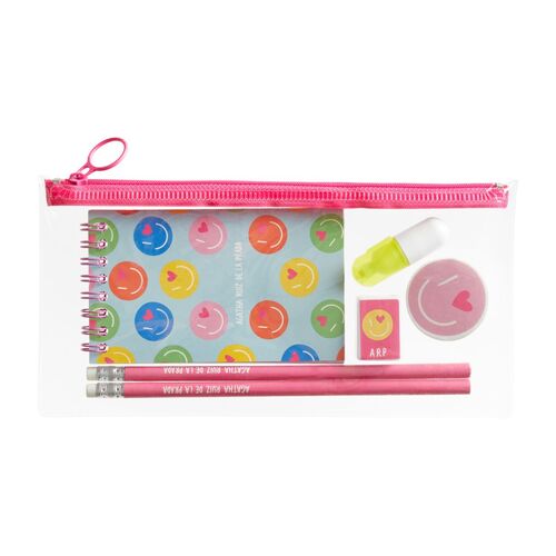 Puna pvc pernica koja sadrži: 2 olovke s gumicom Gumica Šiljilo Text marker Blok Dimenzije pernice: 235 x 115 x 15 mm.
