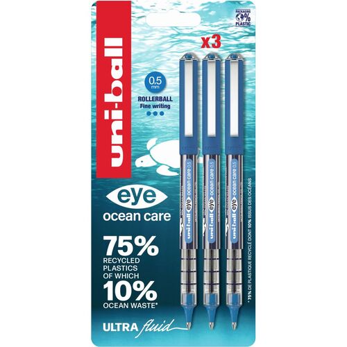 Ista izuzetna kvaliteta, sada čišći i zeleniji roler! Pozdravite sljedeću generaciju legendarne uni-ball Eye olovke za pisanje, uni-ball Eye Ocean Care. Napravljen je od preko 75% reciklirane plastike, od čega je 10% dobiveno iz oceana. Ovaj novi roler smanjuje potrebu za upotrebom sirovih materijala, svodeći upotrebu netaknute plastike na apsolutni minimum. Plastični otpad čini oko 70% ukupnog oceanskog otpada, pa je bilo logično da se ovaj resurs iskoristi za izradu nove uni-ball Eye Ocean Care. Izuzetno pouzdane i izvrsne kvalitete, uni-ball Eye roleri omiljeni su roleri u cijelom svijetu od davne 1994.godine. Možete očekivati istu kvalitetu s novom generacijom uni-ball Eye Ocean Care rolera. I dalje sadrže uni Super tintu koja je otporna na blijeđenje, vodu i falsificiranje, što ih čini idealnim za upotrebu na važnim dokumentima. Kroz legendarni prozorčić na kućištu možete vidjeti koliko vam tinte preostaje. U kombinaciji s jedinstvenim sustavom protoka tinte 'uni-Flow' osigurava iskustvo ugodnog glatkog pisanja istom kvalitetom i intenzitetom linije do posljednje kapi tinte. Poklopac s rupicom za zrak siguran je za djecu. Vrsta tinte: tekuća pigmentna na bazi vode, odobrena certifikatom ISO 14145/2 za upotrebu na dokumentima. Promjer kuglice: 0,5 mm Debljina ispisa: 0,3 mm Cijena je za viseći eko blister od papira, komercijalno pakiranje je 1 pak (3 plava rolera).