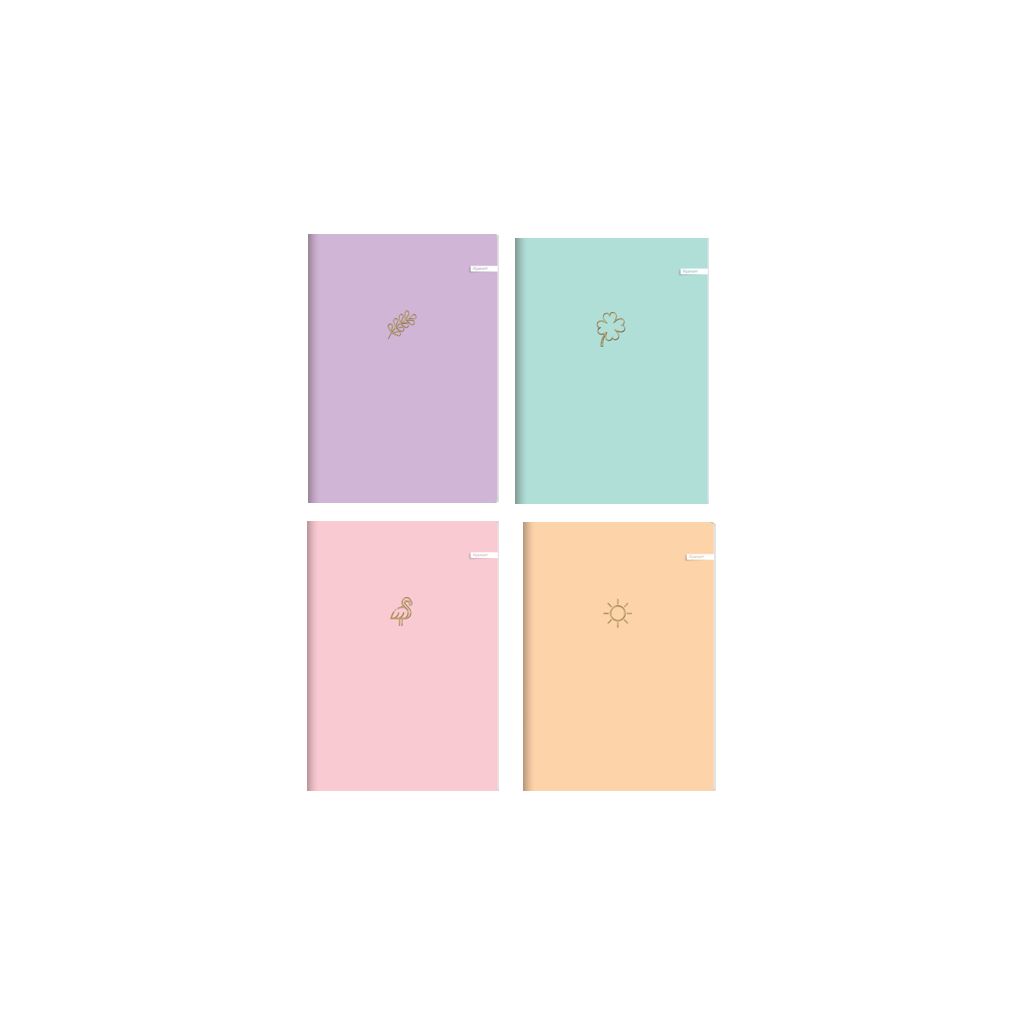 Soft touch kolekcija bilježnica. Broj listova: 60/zaobljeni rubovi Papir: 70 gr/m2 bijeli papir Format: A4 (210x297) Tisak: 2/0 + velvet plastifikacija + zlatotisak Korice: 300 gr/m2 Broj motiva: 9 Pakiranje: 10/40/2400 (folija/karton/paleta)