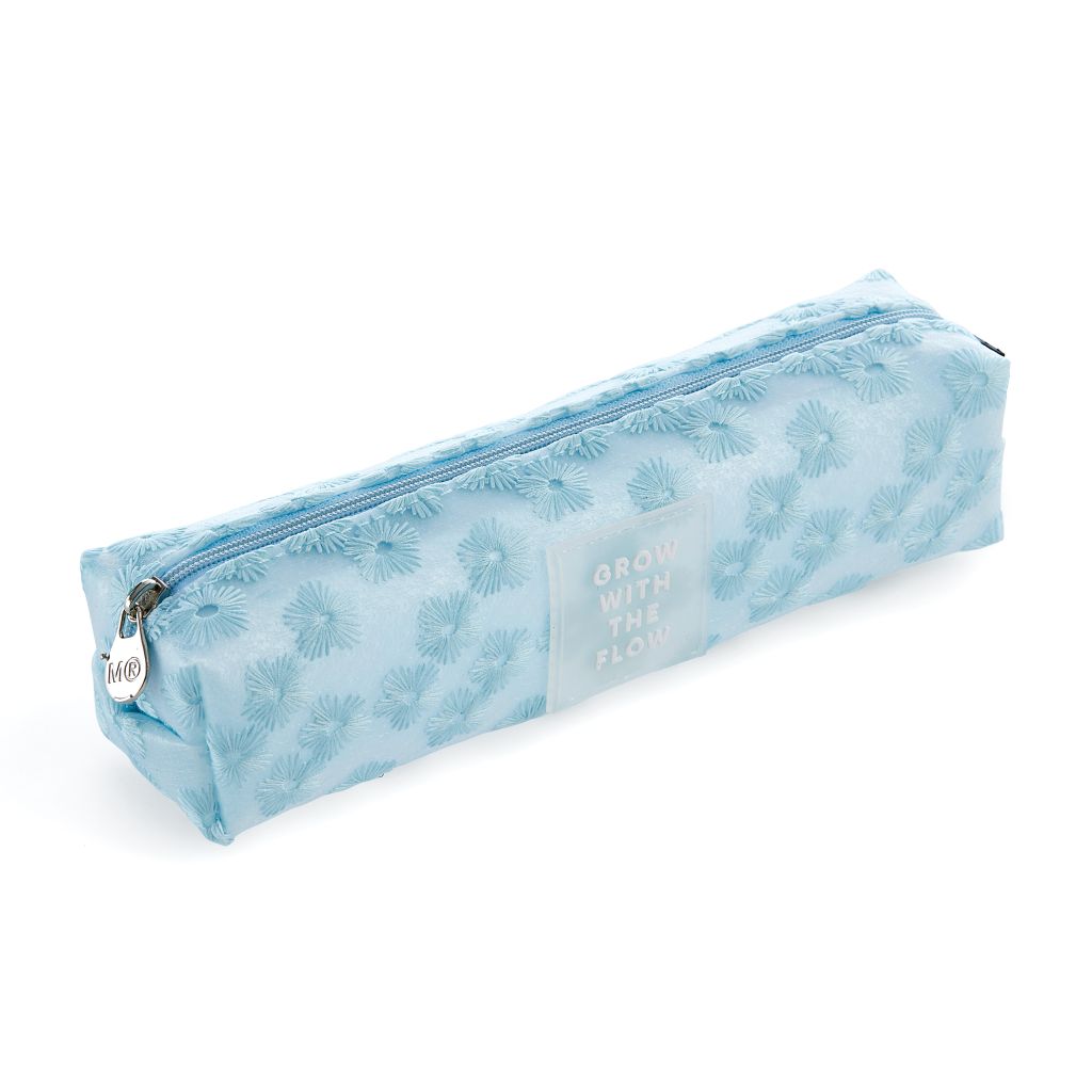 Plava pernica sa izvezenim cvjetovima. Dimenzija kutije: 210 x 60 x 50 mm . Dimenzija pernice: 200 x 45 x 45 mm. Materijal: poliester sa izvezenim cvjetovima.
