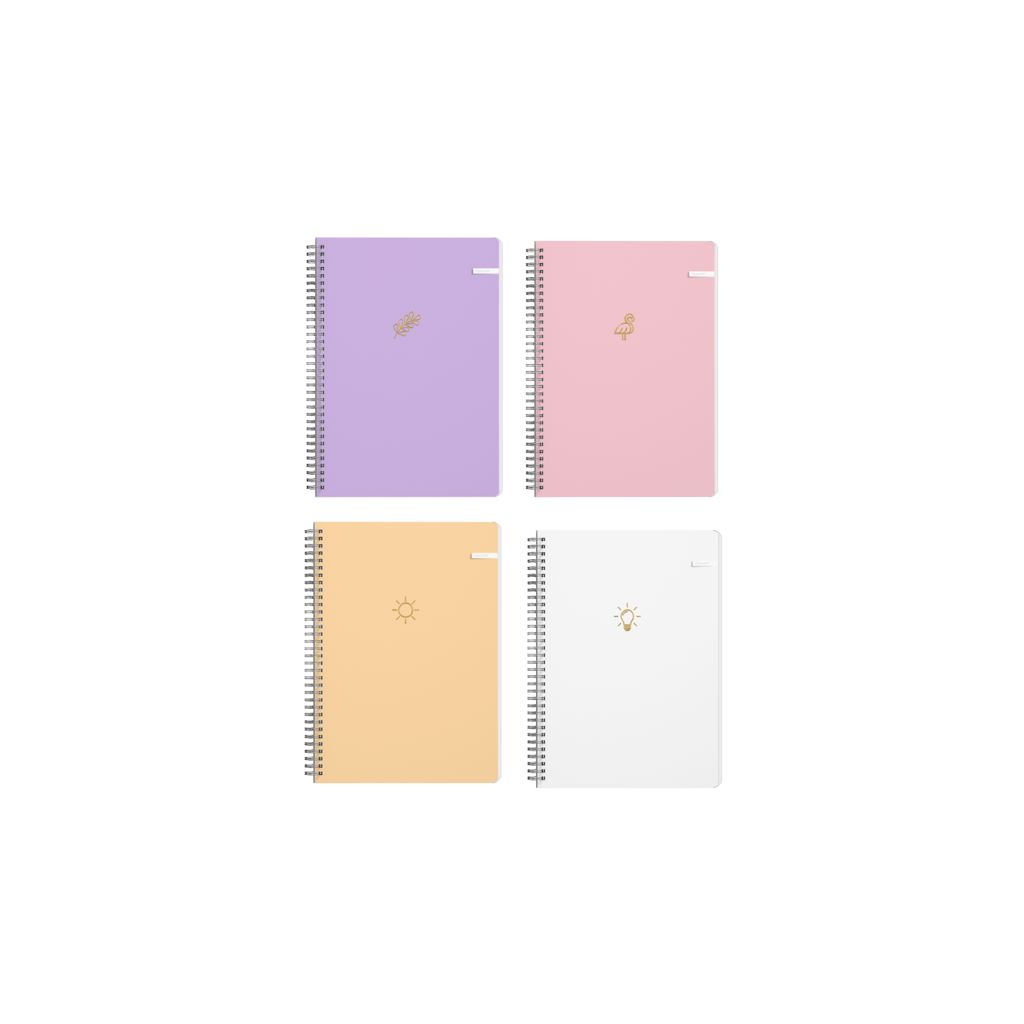 Soft Touch kolekcija bilježnica sa spiralom Broj listova: 80/zaobljeni rubovi Papir: 70 gr/m2 bijeli papir Format: A4 (210x297) Tisak: 2/0 + Zlatotisak Korice: 350 gr/m2 + soft plastifikacija Listovi mikroperforirani + 4 rupe Spirala: dupla, bočno Pakiranje: 5/25/1350 (folija/karton/paleta)