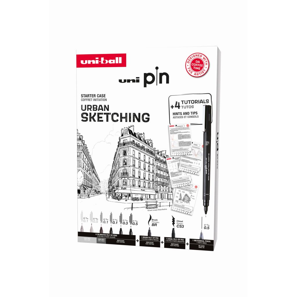 Uni Pin Urban Sketching set by DA COFFEE TIME – Set za crno-bijeli urbani crtež Posebno izdanje razvijeno u suradnji s urbanim umjetnikom DA COFFEE TIME, idealno za sve koji žele crtati gradske prizore, arhitekturu i svakodnevne detalje. Set sadrži sve potrebno za izradu crteža prema priloženim tutorijalima – bez obzira jeste li početnik ili iskusni crtač. Kombinacija kvalitetnih Uni Pin flomastera, mehaničke olovke i edukativnih materijala omogućuje lako i inspirativno učenje urbanog crtanja. Set sadrži: - Mehaničku olovku M5-228 crnu - Uni pin 01 crni 200(S) - Uni pin 03 crni 200(S) - Uni pin 05 crni 200(S) - Uni pin kist crni (brush) BR-200(S) - Uni pin kaligrafski 3,0 mm crni CS3-200(S) - Uni pin 01 tamno sivi 200(S) - Uni pin 01 svijetlo sivi 200(S) - Uni pin 05 svijetlo sivi 200(S) - Vodič za crtanje – tutorijal 1 - Vodič za crtanje – tutorijal 2 - Vodič za crtanje – tutorijal 3 - Vodič za crtanje – tutorijal 4 - Informativnu brošuru pin 001 ML001 Materijali su dostupni na 14 jezika putem QR koda.