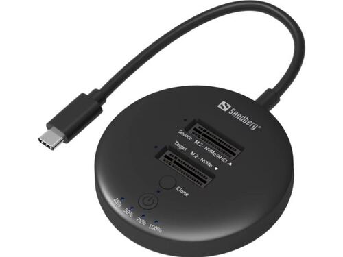 Sandberg USB 3.2 Cloner Dock for NVMe M.2 SSD - makes it easy to read, write, and clone your NVMe SSDs. Cloning from one disk to another can be done entirely without connecting to a PC. The dock also works perfectly as a disk expansion, allowing you to have two extra SSDs connected to your computer simultaneously. Ideal for backup, data transfer, and storage expansion. Supports up to 20 Gbps via USB-C and requires no tools or software installation. Supports offline 1:1 clone (no PC required) Dual-bay M.2 NVMe SSD support USB3.2 Gen2 SuperSpeed up to 10 Gbps (backward compatible) Transfer speed max: USB3.2 Gen2x1 *2 SSD: Up to 10 Gbps; USB3.2 Gen2x2 *1 SSD: Up to 20 Gbps SSD types supported: NVMe, M.2, M Key SSD sizes supported: 2230 2242 2260 2280 22110 LED indicators for power and activity Max. capacity supported: 8 TB NOTE: SATA M.2 SSD not supported