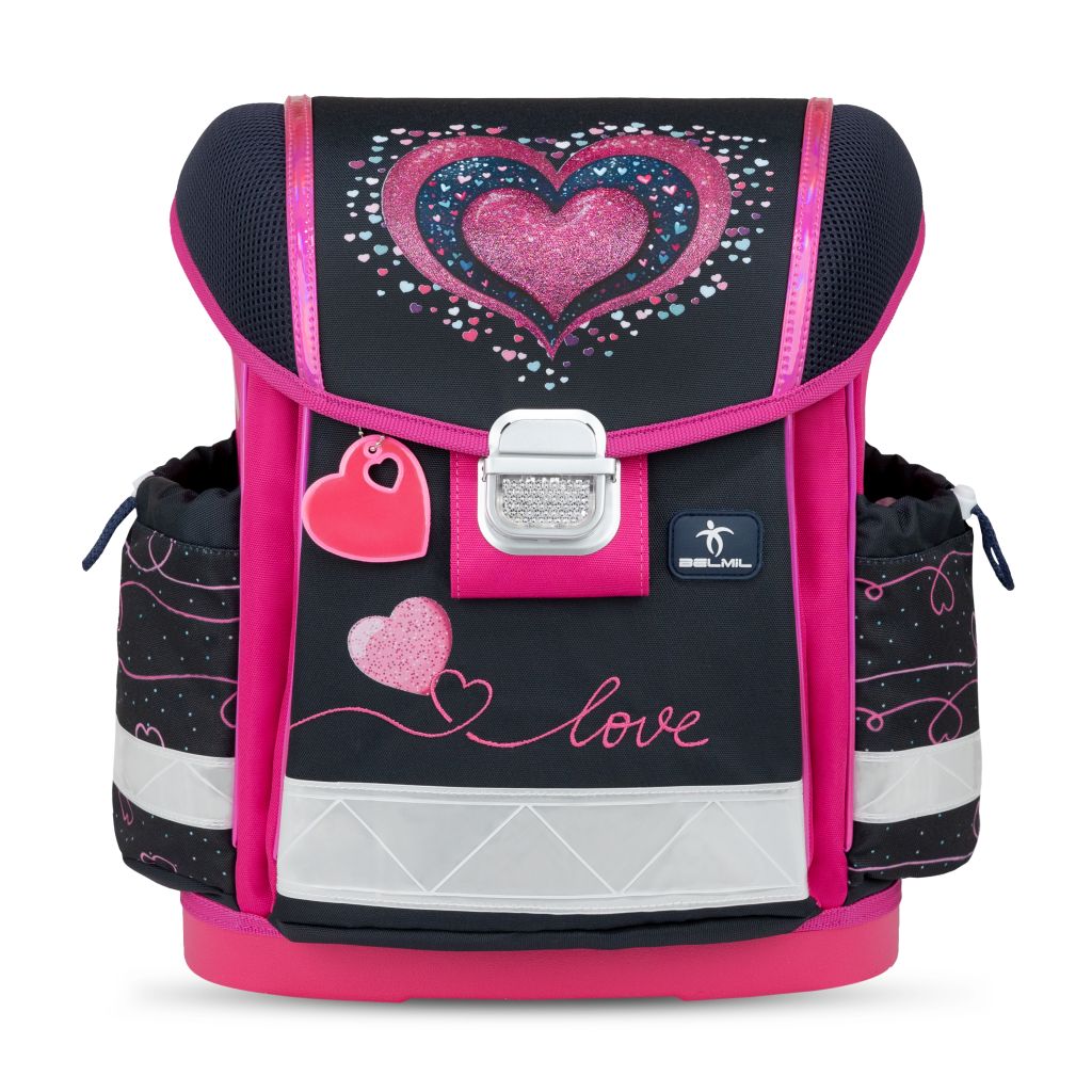 "Classy" je klasični model raznih dizajna za djevojčice i dječake. Preporučena dob: 6-9 god. Veličina: 36x32x19cm. Težina: 930-990gr. Kapacitet: 19 L. Lagana, ali izdržljiva i jaka torba izrađena od kvalitetnih, čvrstih i vodootpornih materijala. Izdržljivost: Ojačanja sa svih strana i snažno dno torbe povećava stabilnost i izdržljivost. Donji dio ima i dodatne funkcije: osigurava da torba ostane u istom položaju, sprječava prljanje i održava sadržaj suhim čak i po kišnom vremenu. Prsni remen: Prsni remen može se lako pričvrstiti na školsku torbu za optimalnu raspodjelu tereta. U slučaju da se remen ne koristi, može se ukloniti u bilo kojem trenutku. Posebno je važno kada djeca voze bicikl ili trče jer tada sprječava da torba sklizne s dječjih ramena. Prostrani unutarnji pretinci: Imaju pametno podijeljene odjeljke koji djeci pomažu organizirati školski pribor. Unutarnji dizajn ima tri velika odjeljka. Sve veličine bilježnica i knjiga savršeno odgovaraju odjeljcima. Boca vode (do 0,7 L) i kišobran mogu se lako spremiti u bočne džepove. Gornji poklopac ima držač rasporeda. Prednji džep namijenjen je za pohranu pernice ili kutije za ručak. Također postoji i odjeljak za mobilni telefon i manje predmete, poput karata i ključeva. Ergonomija: Ergonomski oblik i prozračna podstava na leđima za dodatnu udobnost. Dobro podstavljene naramenice koje su podesive u dvije točke: na vrhu i na dnu za savršeno pristajanje. Za optimalnu raspodjelu težine torbi dodan je podesivi i uklonjivi remen za prsa. Svi modeli Belmil školskih torbi posjeduju AGR certifikat. Aktion Gesunder Rücken dodjeljuje se samo proizvodima čiji je dizajn ugodan za leđa i potvrđen je od strane neovisnog povjerenstva za testiranje, sastavljenog od stručnjaka iz različitih medicinskih disciplina. Sigurnost: S Belmil školskom torbom sigurnost je zajamčena čak i kada padne mrak: pažljivo postavljene reflektirajuće trake sa svih strana, čvrsta i metalna kopča s reflektirajućom značajkom osiguravaju dobru vidljivost noću. Napomena: točna težina proizvoda može varirati +/- 5% Jamstvo: 2 godine