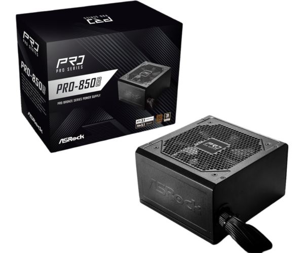 ASRock PSU PRO Series PRO-850B, 850W, 80 Bronze - 80 PLUS BRONZE Certified ATX3.1 PCIe5.1 Ready Native 12V-2x6 Connector Dual Color Design Low noise 120mm FAN Reliable 3-Year Warranty Dimensions(L x W x H) - 140mm x 150mm x 86mm Cable Type: Flat Motherboard cable (24pin): 1x, EPS 12V CPU connectors (4 4pin): 1x, PCIe5.1 connectors(12 4pin) Dual Color: 1x, PCIe connectors (6 2pin): 2x, 4-pin Peripheral connectors: 2x, SATA 5-pin connectors: 4x