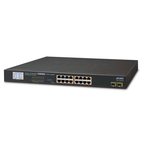 Planet GSW-1820VHP, 16-Port 10 100 1000T RJ45 802.3at af PoE 2-Port Gigabit SFP Desktop Rackmount Unmanaged Switch with LCD PoE Monitor (300W PoE Power Budget, Standard VLAN Extend mode options). Supports PoE power up to 30.8 watts for each PoE port. Each port supports 52V DC power to PoE powered device. Switch Fabric 36Gbps non-blocking, Switch Throughput 26.8Mpps@64Bytes . Dimension 233 x 440 x 44 mm (1U height)