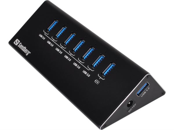 Sandberg USB 3.0 Hub 6 1 ports - Interface standard: USB 3.0 USB 3.0, USB 2.0 and USB 1.1 compliant Supports SuperSpeed (5 Gbit sec), high-speed (480 Mbit s), full-speed (12 Mbit s) transfer rates USB 3.0 connectors: 7 USB 3.0 A-female and 1 micro B-female 1 USB A-female charging port 2.4A max Supplying USB 3.0 ports with up to 900mA (with power adapter) Built-in overload protection (with power adapter) Power adapter for EU UK type 230V AC, output DC 12V 3.0A Can work without the AC power supply for low power consumption items