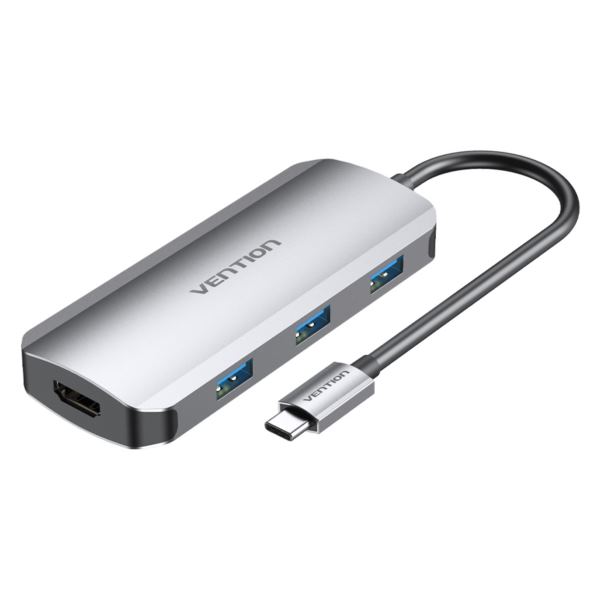 Vention USB-C to HDMI USB 3.0x3 PD Docking Station - 5-in-1 Upstream port(s): USB 3.1 Type C Downstream port(s): HDMI USB 3.0x3 PD Resolution: 4K@30Hz USB speed: 5Gbps Power supply: PD 100W (20V 5A) Casing: Aluminum alloy 0,15m
