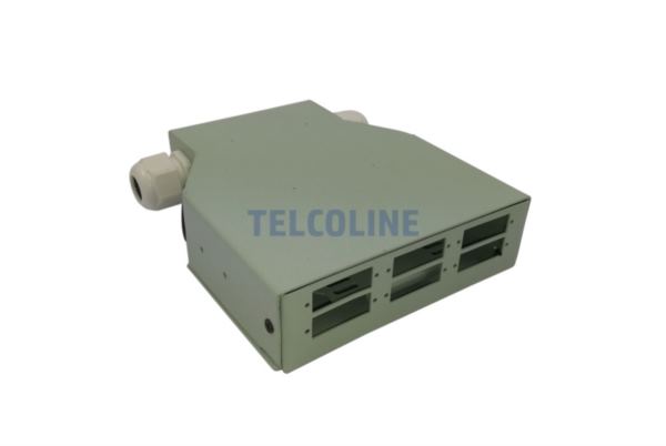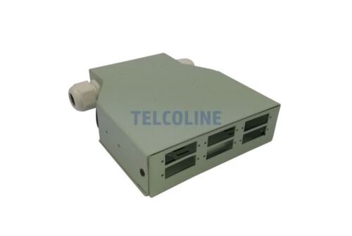 NFO Patch Panel DIN Rail, 6x SC Duplex - designed to be mounted on a DIN rail Equipped with two PG 13.5 cable glands (cables with a diameter of 6-12 mm) and 4 splice inserts, allowing the assembly of 24 fiber optic splices The housing is made of 1 mm thick powder coated steel. The housing has two holes with a diameter of 20 mm. Dimensions: 140 x 125 x 35 mm