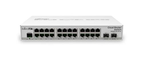 Cloud Router Switch SwOS RouterOS 24xGbE 2xSFP cage, desktop, wire speed connectivity with several new switching features.800 MHz, L5 licence, RAM 512 MB, operating temperature 40 C to 60 C, passive PoE-in, passive fan. 285 x 144 x 44 mm. 24V DC adapter included.